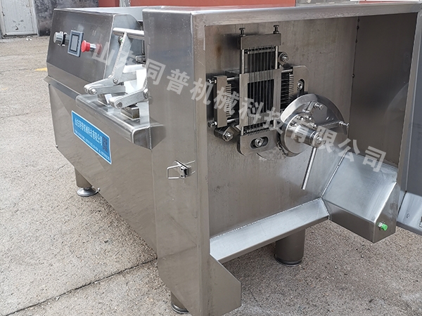 點亮自動按鈕,開啟急停按鈕,關閉出料大門,大門感應開關動作;推緊側壓手柄,相應的推柄感應開關動作;自動 按鈕點亮,電源接通,油泵工作,推桿開始推出原料,刀柵抽拉及三維切刀開始工作,切割原料。當推桿將推塊推向最前端時,推塊下方的感應開關動作,(我同普機械特別設計的智控系統)會繼續推出余料,直到將原料完全推出,刀柵及切刀停止切割,同時推桿帶動推塊快速返回到初始點,推塊下方的終端感應開關動作,推塊停在初始處,完成一個工作周期,拉開料倉,原料從輔料倉掉入,關閉推柄迅速進行下一次切割。 主電機經減速器帶動刀柵,作上下及左右往復運動,將推塊推出的原料切割成條狀,再由三維切刀將原料切割成丁塊狀的產品。