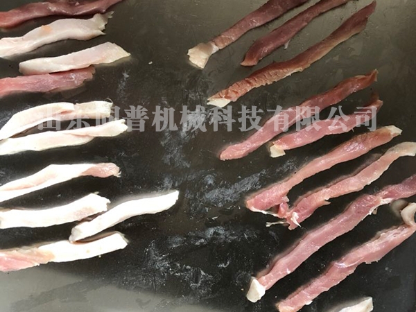 輸送帶條紋狀,清洗方便,厚度2mm,可切出均勻的薄肉片,在-20度的條件下,皮帶也是正常使用。刀片采用進口材質,韌性好,硬度高,使用壽命長,在高頻運動工作過程中不會斷裂,降低產品的成本