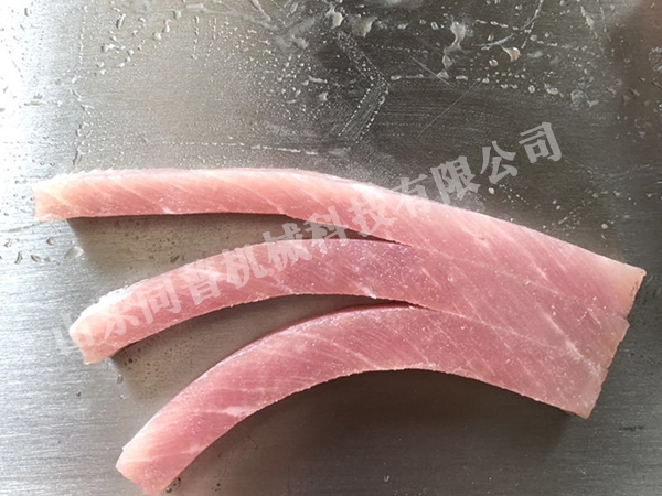本設備是專業用于鮮品或者熟品的無骨雞胸、鴨胸、牛肉、豬肉切片熟對肉的橫向(水平)整肉一次性多片切割,也就是把一塊完整的肉放在機器的輸送帶上,輸送帶傳送過去后這塊雞胸肉就完全切好了。適合加工里脊肉片,雪花雞柳,無骨雞柳等產品的切片,配上我公司生產的切條機更省工,省力,提高產量。