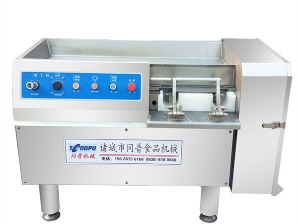 切丁機是肉類制品生產制作工藝中的一個重要設備。將肉塊,脂肪,蔬菜類等主要原料,切割成用戶所需要的片,條,塊等形狀,調整刀柵的間隔尺寸可切出不同尺寸的產品。產品長度尺寸的大小由推進速度旋鈕來調節。