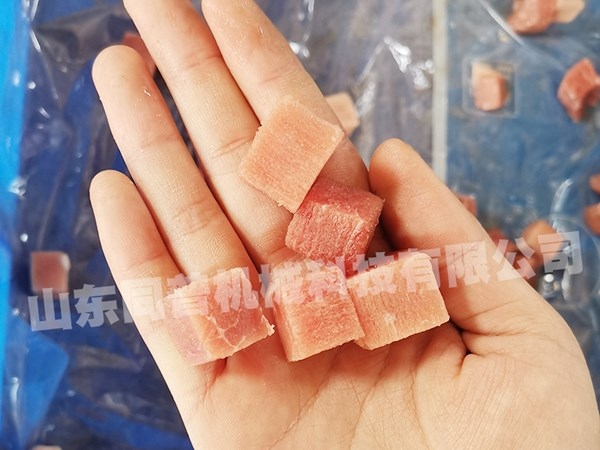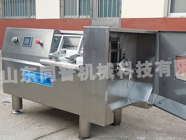 切丁機是肉類制品生產制作工藝中的一個重要設備。將肉塊,脂肪,蔬菜類等主要原料,切割成用戶所需要的片,條,塊等形狀,調整間隔尺寸可切出不同尺寸的產品。產品長度尺寸的大小由推進速度旋鈕來調節。