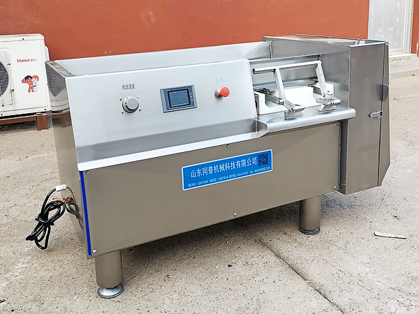 切丁機是肉類制品生產制作工藝中的一個重要設備。將肉塊,脂肪,蔬菜類等主要原料,切割成用戶所需要的片,條,塊等形狀,調整間隔尺寸可切出不同尺寸的產品。產品長度尺寸的大小由推進速度旋鈕來調節。