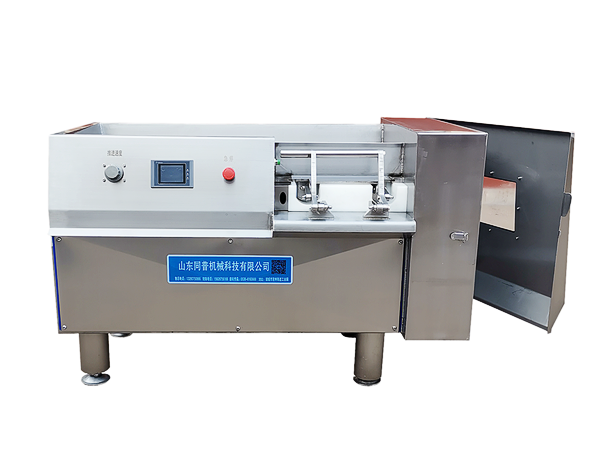 切丁機是肉類制品生產制作工藝中的一個重要設備。將肉塊,脂肪,蔬菜類等主要原料,切割成用戶所需要的片,條,塊等形狀,調整間隔尺寸可切出不同尺寸的產品。產品長度尺寸的大小由推進速度旋鈕來調節。